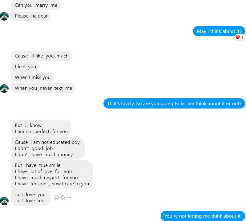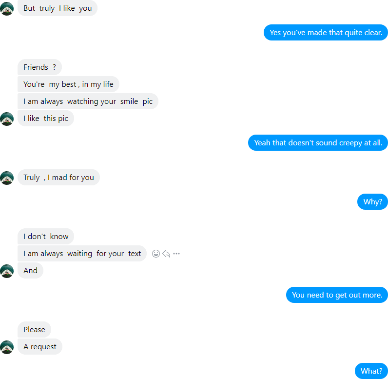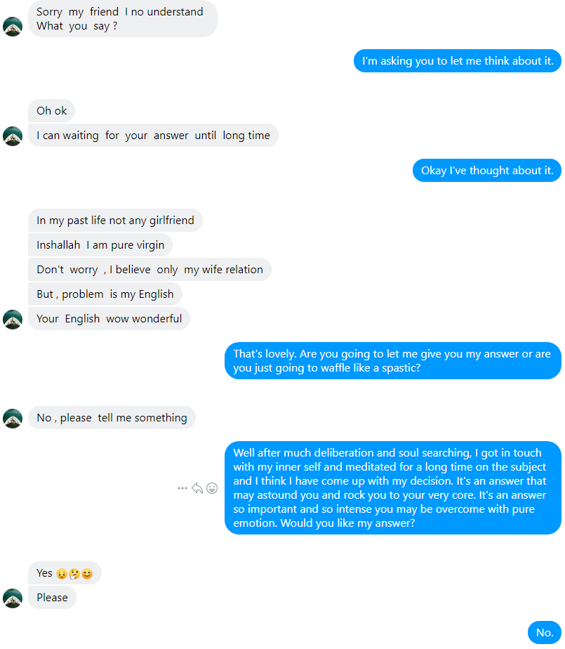 This guy is great. He's been messaging me for months and seems completely oblivious to my sarcasm and utter disinterest in him. He seems to think I'm nice, loving, caring and has asked me to marry him several times. He's also convinced that I'm a Muslim even though I've told him I'm a Heatherist and part-time Satanist. He's such a sweetie.